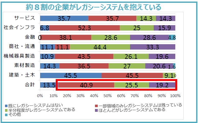 そして、そうこうしているうちに、徐々に「運用できるエンジニアがいなくなり」「システムが複雑化し」「更改に掛かる費用が増大」することで塩漬けになっているケースが多い。これらシステムは大規模システムが多いため、中小企業というよりは大企業に起こりうる傾向であるが、以下の通り、約8割もの企業でレガシー化したシステムを抱えている状態である。