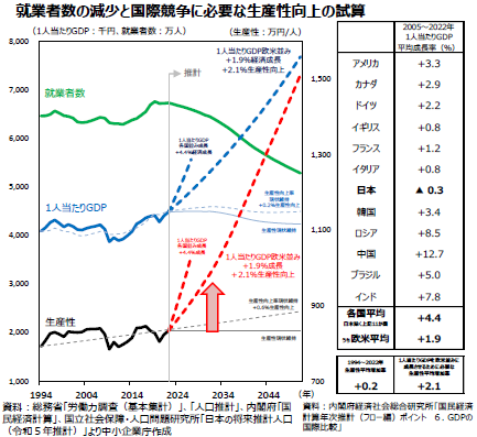 やはり、大きな課題としては、需要回復による人材難に対し、人材育成やIT投資等による生産性の向上や外国人労働者の活用等が引き続き求められる。特に生産性は、OECDの中でも低く格差が見られる。GDPと生産性は正の相関があるため、GDPを高めるには、この一人当たりの生産性を高めることが重要となる。そして、これまでの延長線上での成長速度では不十分であり、何らか劇的な高次学習に近いような変化がないと、米国に追いつくのは難しいらしい。