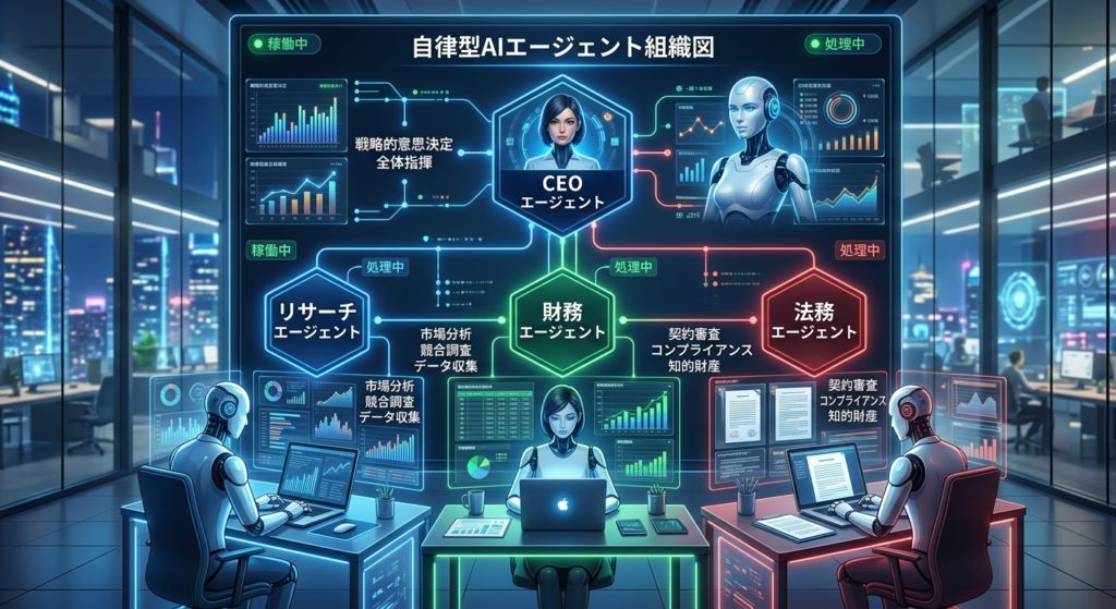 また、各エージェントに「財務の専門家として振る舞う」「弁護士のように法的リスクを探る」といった専門的なペルソナ(人格設定)を与えることで、社内の組織構造をそのままAIの中に再現できます。少人数でも、大企業のような多機能なオペレーション体制を持つことが可能になるのです。