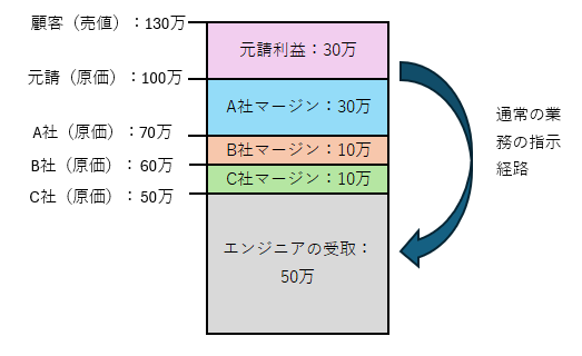 上記の例を見ると、元請けの100万の原価に対し、C社のエンジニア自体は半分の50万しか受けて取れていない(当然経費分があるのでさらに引かれる)。